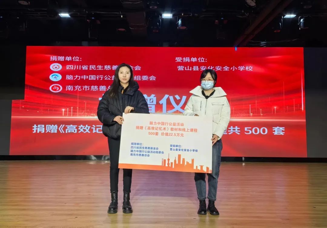 2022年2月18日,在成都锦江宾馆举行的“新疆生产建设兵团第九师成都招商引资推介会”上,脑力中国受“脑力中国行”公益活动组委会委托,向新疆生产建设兵团第九师捐赠了价值2735万元的全套课程和教材。国际脑力运动委员会主席成词高、新疆生产建设兵团第九师副师长卢根昌、中国公益事业形象大使马彩青出席了捐赠仪式。